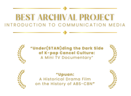 In-Charge: Department of Communication Faculty Members1. Submit either the best midterm or final output from their class/es in each professional course including its grade during the final grade submission. The output should be aligned with what has been reflected in the course syllabi approved by the department;2. Encode the title, team members, and grade in the shared Excel spreadsheet which contains the nominees in the professional courses of BA in Communication. The faculty-in-charge (Special Projects class) shall send the shared Excel a day before the grade/ outputs submission and must be cleared by the department chair;3. Decide and agree on which of the outputs/ nominees will be declared as the best of the best awarded and recognized. The group of faculty members handling one common course should do this.