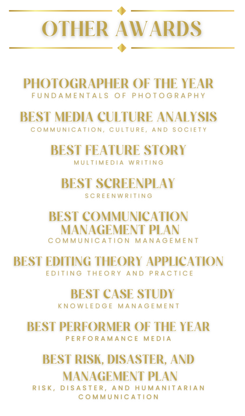 To acknowledge Communication students on their best accomplishments each academic yearTo showcase communication students' abilities through distinctive performances and exposureTo urge the communication students to go above and beyond in the upcoming academic year in acquiring fundamental skills for their future outputs and evaluations.To make it possible for the working committee of the organization, which consists of communication students, to plan the event, including project initiation, launch, assessment, and integrating theories into practices acquired from the management and production courses.